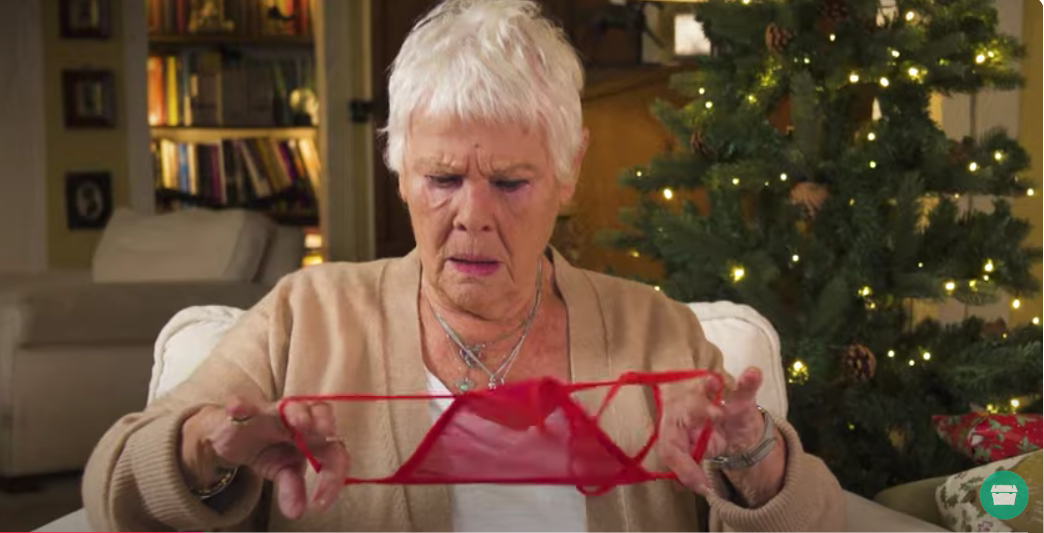Η Dame Judi Dench απέμεινε άναυδη οταν άνοιξε το κουτί του χριστουγεννιάτικου δώρου της για να ανακαλύψει μέσα σ’ αυτό ένα μικροσκοπικό κόκκινο στρινγκ. Στο ξεκαρδιστικό βίντεο για φιλανθρωπική καμπάνια, η 89χρονη σταρ απεικονίζεται να κατεβαίνει κρυφά κάτω για να ξετυλίξει τα δώρα της νωρίς το πρωί των Χριστουγέννων.