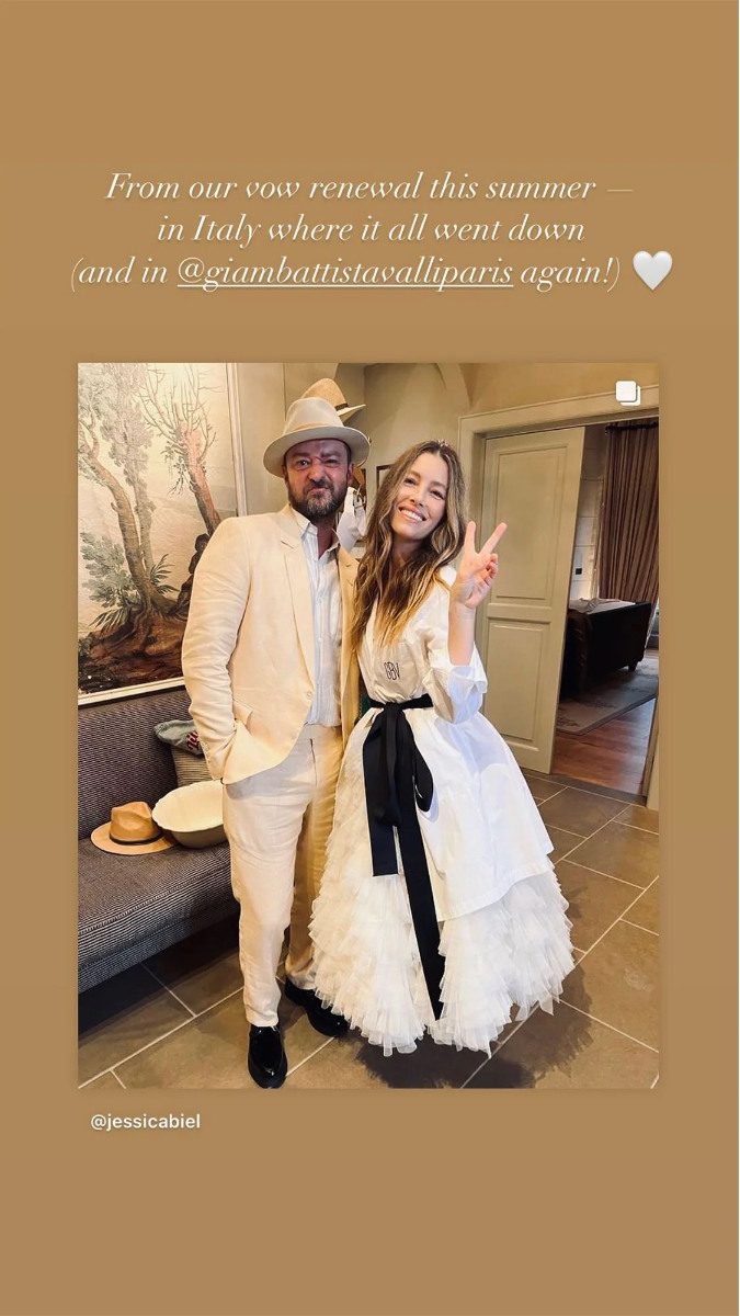 «Από την ανανέωση των όρκων μας αυτό το καλοκαίρι στην Ιταλία όπου συνέβησαν όλα», έγραψε στη λεζάντα της φωτογραφίας. Το στιγμιότυπο δείχνει επίσης την ηθοποιό με ένα βολάν φόρεμα Giambattista Valli (είχε επιλέξει τον Ιταλό σχεδιαστή και την ημέρα του γάμου της) κάτω από ένα πουκάμισο με κουμπιά συνδυασμένο με μια μαύρη κορδέλα. Για την περίσταση, ο Timberlake φόρεσε ένα μπεζ λινό κοστούμι και ένα ασορτί fedora.