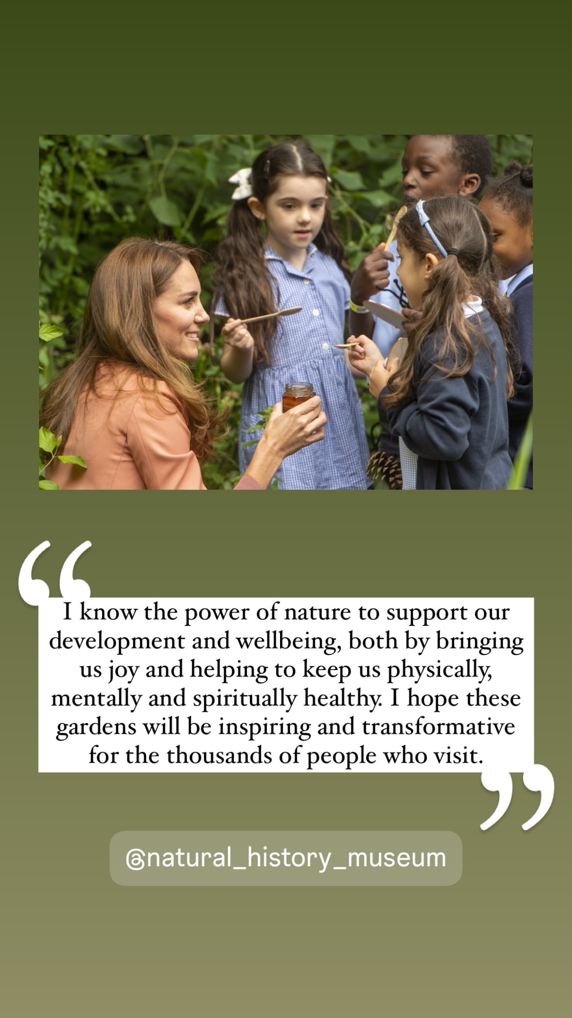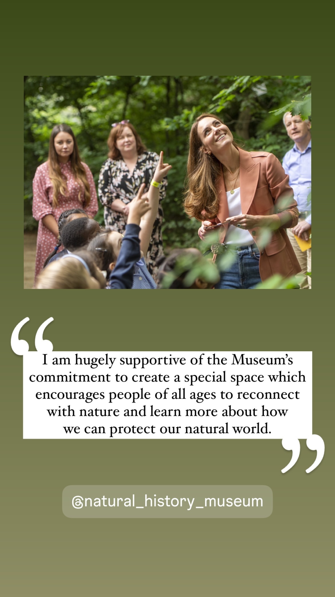 Σε ένα story στο Instagram, η Kate Middleton έγραψε για το Μουσείο Φυσικής Ιστορίας του Λονδίνου, το οποίο μόλις άνοιξε έναν νέο χώρο πρασίνου: “Υποστηρίζω εξαιρετικά τη δέσμευση του μουσείου να δημιουργήσει έναν ιδιαίτερο χώρο που ενθαρρύνει τους ανθρώπους όλων των ηλικιών να επανασυνδεθούν με τη φύση και να μάθουν περισσότερα για το πώς μπορούμε να προστατεύσουμε τον φυσικό μας κόσμο”, προσθέτοντας: