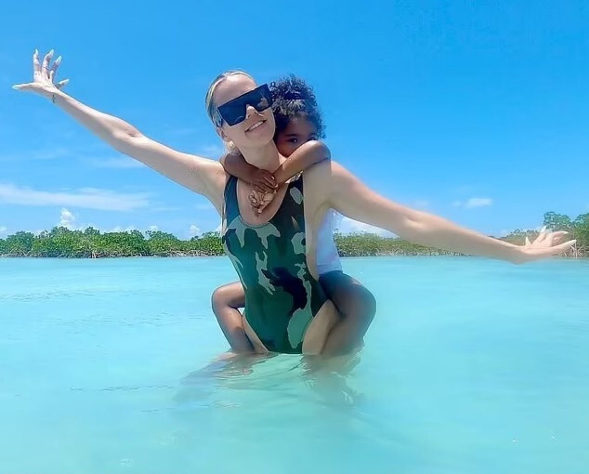 Μόλις την περασμένη εβδομάδα, δημοσίευσε μια σειρά από στιγμιότυπα της ίδιας να στέκεται στα καταγάλανα νερά του ωκεανού με την True να κρέμεται στην πλάτη της.