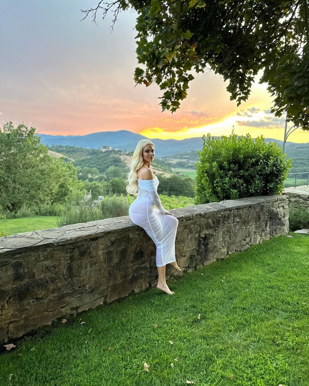 Σε μία από τις εικόνες που δημοσίευσε, η 39χρονη ριάλιτ σταρ (η φωτογραφία του εξωφύλλου μας) κάθεται πάνω σε ένα πλινθόκτιστο φράχτη απολαμβάνοντας τη δύση του ήλιου και το απέραντο πράσινο τοπίο.