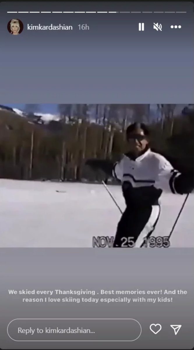 “Κάναμε σκι κάθε Ημέρα των Ευχαριστιών», έγραψε η Kim δίπλα στο βίντεο. “Οι καλύτερες αναμνήσεις όλων των εποχών! Και είναι ο λόγος που λατρεύω να κάνω σκι σήμερα, ειδικά με τα παιδιά μου”.