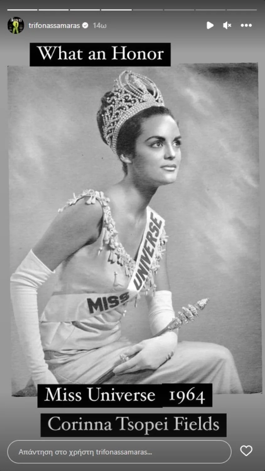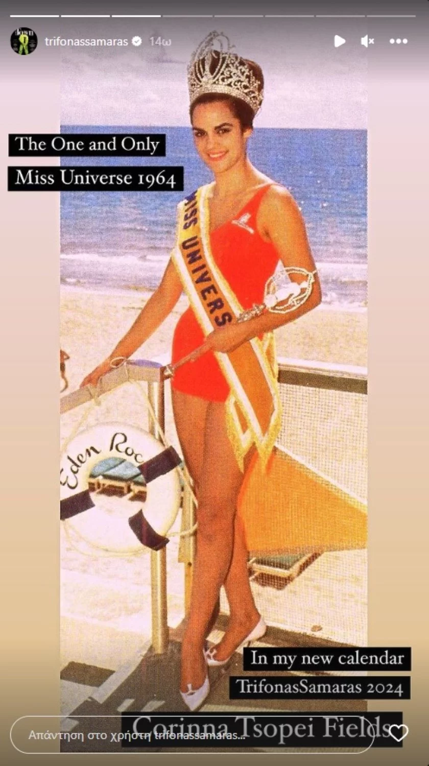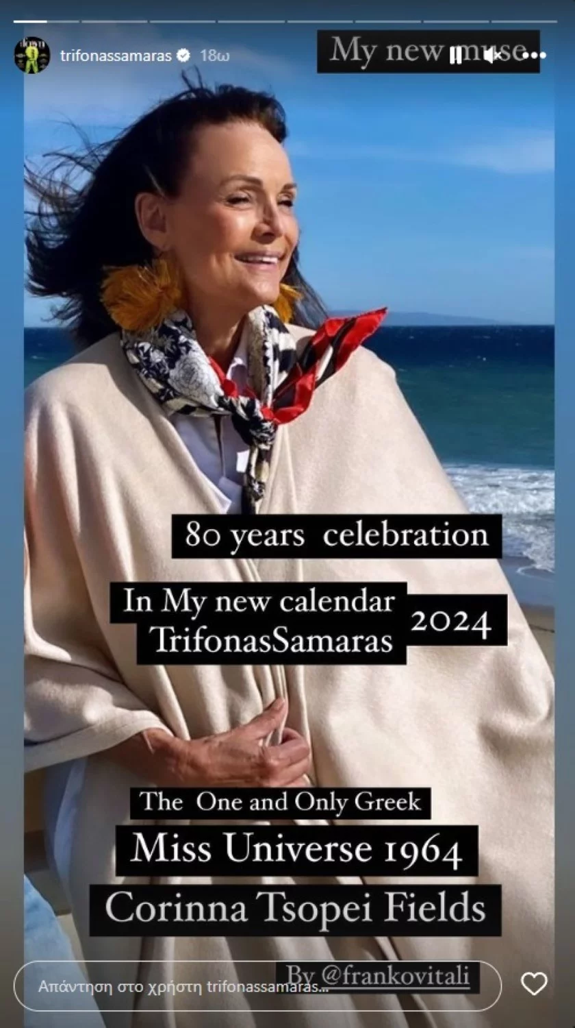 Η Μις Υφήλιος του 1964, η μοναδική Ελληνίδα που κατέχει τον συγκεκριμένο τίτλο, θα φωτογραφηθεί αποκλειστικά για τον Τρύφωνα Σαμαρά, ο οποίος θα επιμεληθεί την εμφάνισή της. Αξίζει να σημειώσουμε ότι τη νέα χρονιά, η Κορίνα Τσοπέη θα κλείσει τα 80 της χρόνια και αποφάσισε να αφεθεί στα χέρια του, αναμένοντας ένα εντυπωσιακό αποτέλεσμα.