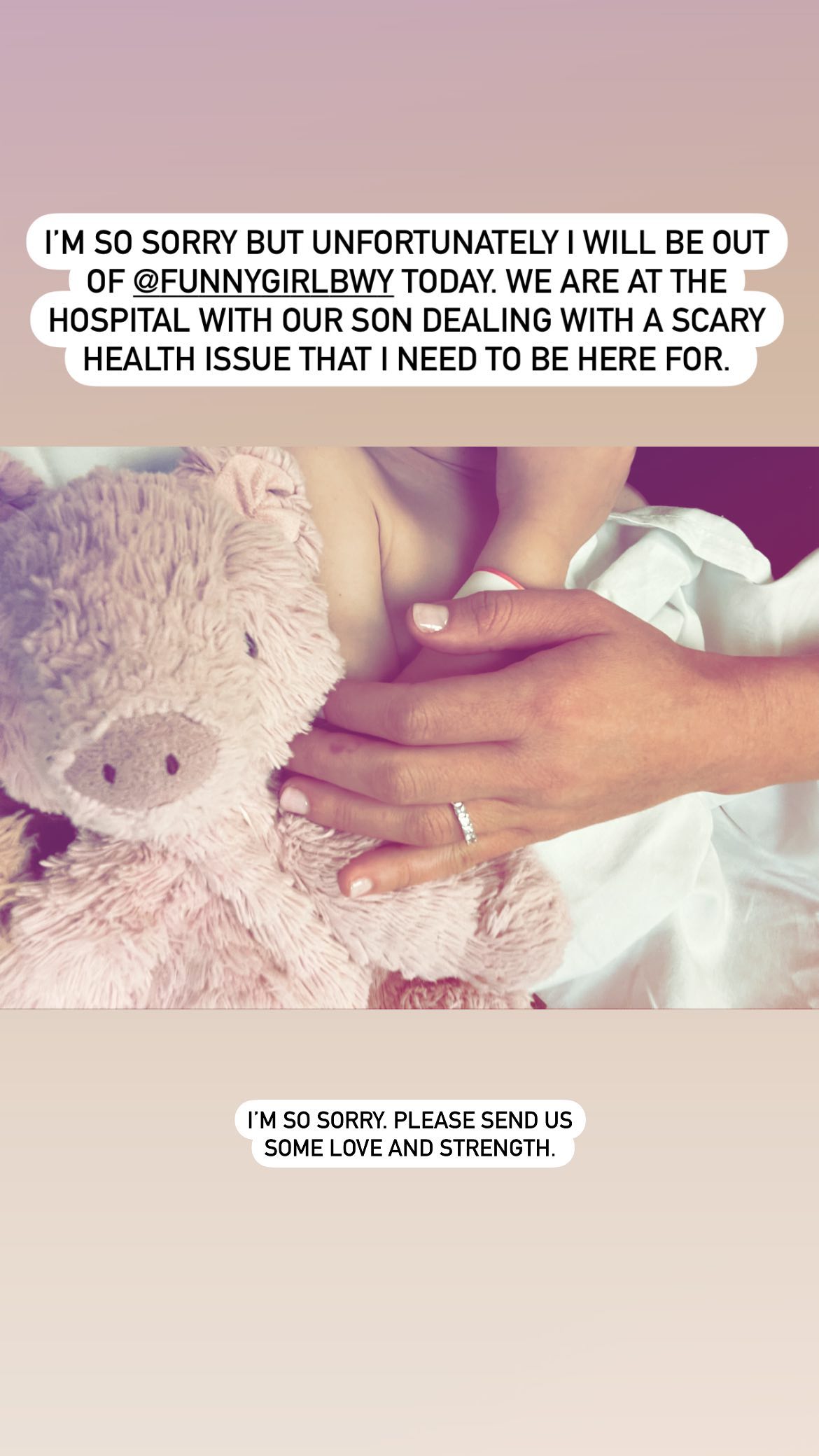 “Λυπάμαι αλλά δυστυχώς θα λείψω από το Funny Girl σήμερα” έγραψε η ηθοποιός στη λεζάντα της φωτογραφίας που ανέβασε, στην οποία κρατά το χέρι του Ever.