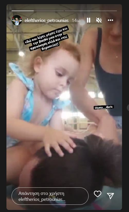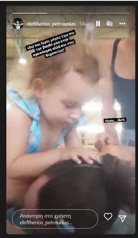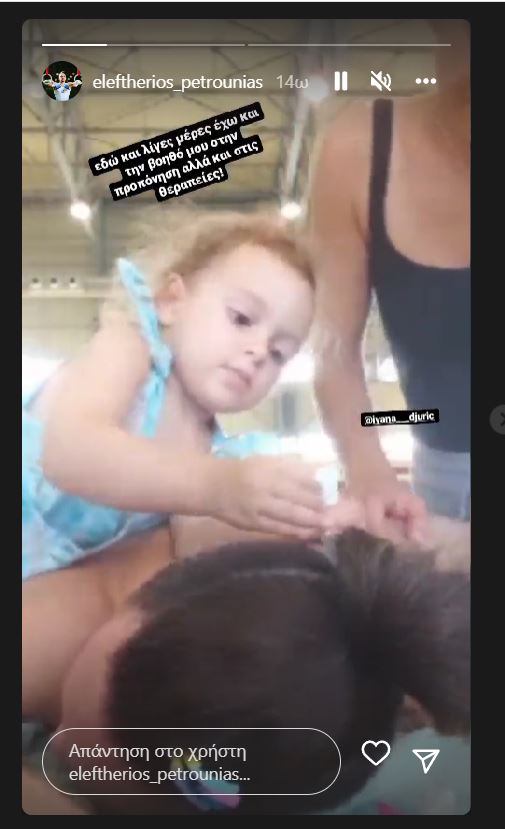 Έτσι και τώρα, μοιράστηκε στιγμές από την προπόνηση και τη θεραπεία του στο γυμναστήριο όπου έχει την καλύτερη βοηθό. Ενώ η ειδική κάνει θεραπεία στον Λευτέρη Πετρούνια, αναλαμβάνει η Σοφία τον ρόλο και φροντίζει με τον καλύτερο τρόπο τον μπαμπά της.
