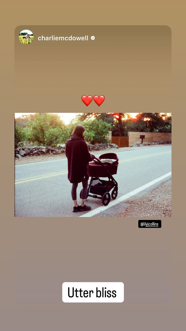 Η σταρ του Emily in Paris αναδημοσίευσε στο Instagram μια φωτογραφία από το προφίλ του Charlie, όπου εθεάθη να απολαμβάνει μια βόλτα με το μωρό της ενώ σπρώχνει το καροτσάκι κατά μήκος ενός ηλιόλουστου, δεντρόφυτου δρόμου.