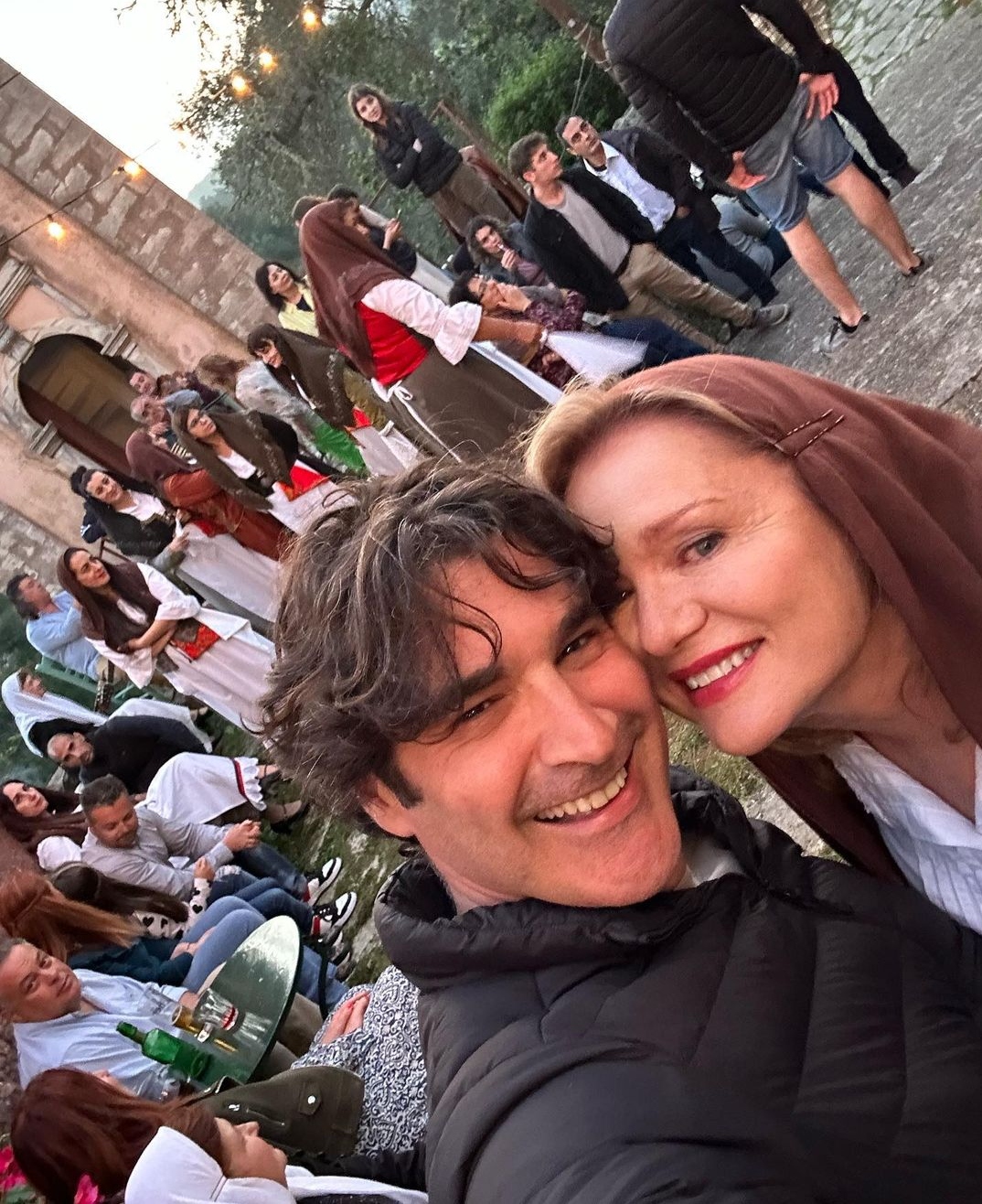 Συγκεκριμένα, ποζάρει γελαστός με την αγαπημένη του Μαρία Καβογιάννη, με φόντο ένα παραδοσιακό γλέντι που έχει στηθεί για τις ανάγκες του γυρίσματος, με τον Πολιτιστικό Σύλλογο Παξών.