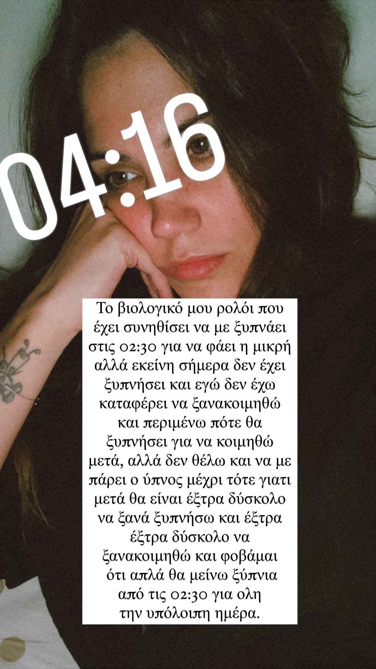 Όπως έγραψε: “To βιολογικό μου ρολόι έχει συνηθίσει να με ξυπνάει στις 02:30 για να φάει η μικρή αλλά εκείνη σήμερα δεν έχει ξυπνήσει. Kαι εγώ δεν έχω καταφέρει να ξανακοιμηθώ και περιμένω πότε θα ξυπνήσει. Aλλά δεν θέλω και να με πάρει ο ύπνος μέχρι τότε γιατί μετά θα είναι έξτρα δύσκολο να ξανά ξυπνήσω και έξτρα έξτρα δύσκολο να ξανακοιμηθώ”