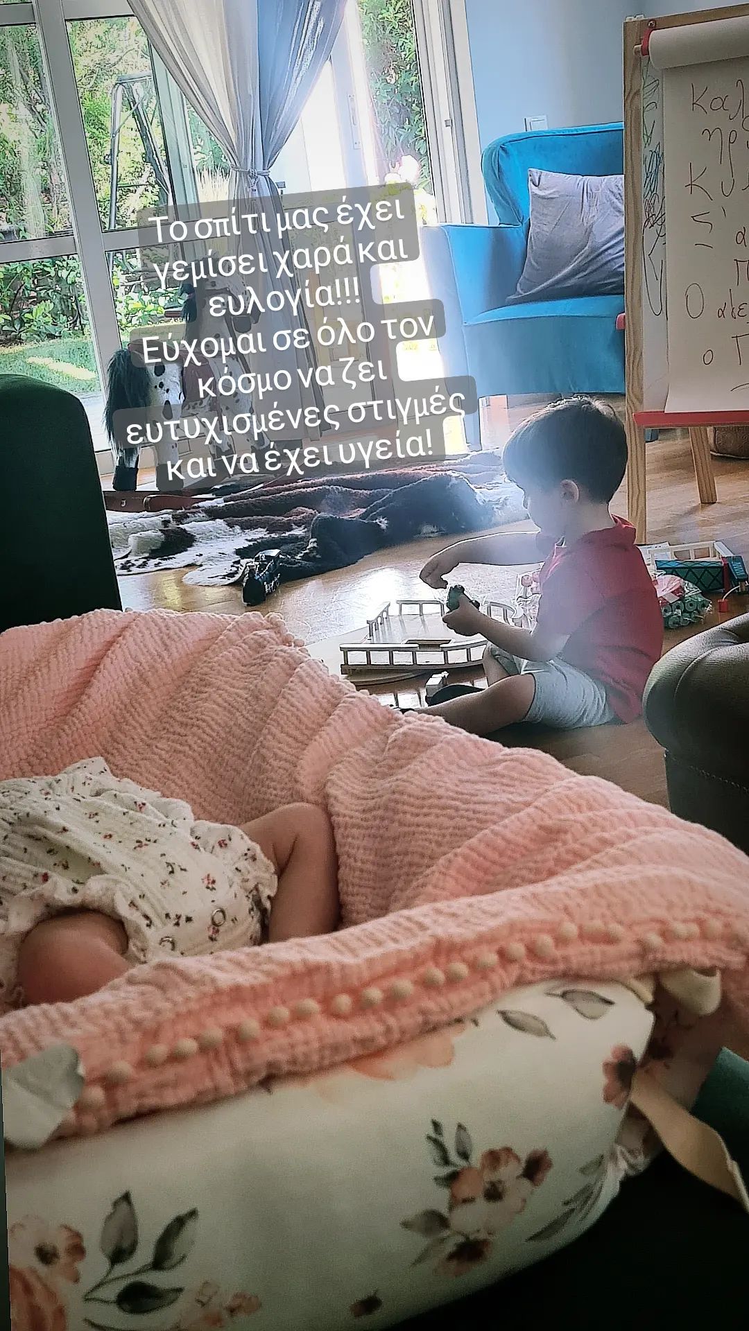 “Το σπίτι μας έχει γεμίσει χαρά και ευλογία!!! Εύχομαι σε όλο τον κόσμο να ζει ευτυχισμένες στιγμές και να έχει υγεία!” γράφει στη λεζάντα όπου φαίνεται ο μικρός Γιώργος να παίζει μπροστά στην καλαθούνα της αδελφούλας του.