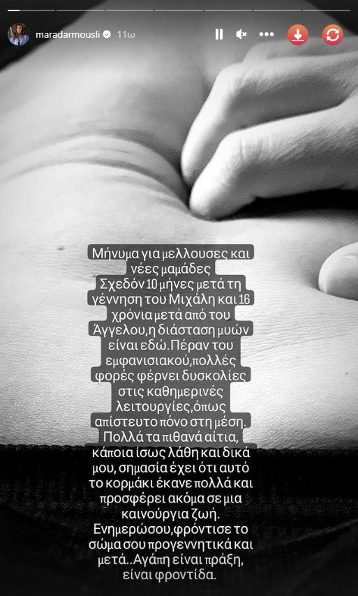 «Μήνυμα για μέλλουσες και νέες μανάδες. Σχεδόν δέκα μήνες μετά τη γέννηση του Μιχάλη και 16 μετά τη γέννηση του Άγγελου, η διάσταση μυών είναι εδώ. Πέρα του εμφανισιακού, πολλές φορές φέρνει δυσκολίες στις καθημερινές λειτουργίες, όπως απίστευτο πόνο στη μέση. Πολλά τα πιθανά αίτια, κάποια ίσως λάθη και δικά μου. Σημασία έχει ότι αυτό το κορμάκι έκανε πολλά και προσφέρει ακόμα σε μια καινούργια ζωή. Ενημερώσου, φρόντισε το σώμα σου προγεννητικά και μετά… Αγάπη είναι πράξη, είναι φροντίδα» έγραψε η Μάρα Δαρμουσλή στο Instagram.