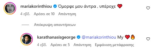 «Όμορφές μου άντρα, υπέροχε», ήταν το σχόλιο που είχε αφήσει δίπλα από ανάρτηση του Γιώργου Καραθανάση με εκείνον μάλιστα να της απαντά με μία κόκκινη καρδιά.