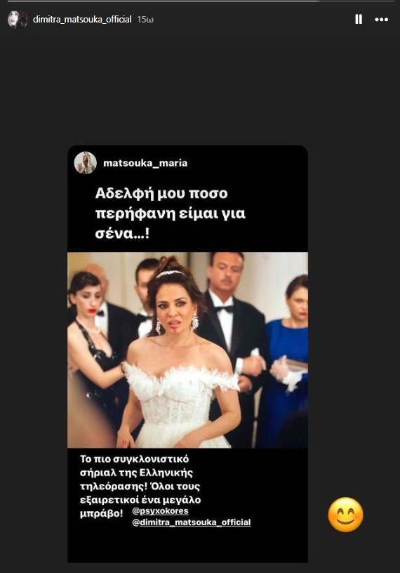 Συγκεκριμένα η Μαρία Ματσούκα ανέβασε ένα στιγμιότυπο από το χθεσινό επεισόδιο και έγραψε: “Αδελφή πόσο περήφανη είμαι για σένα…!”. Και συνέχισε: “Το πιο συγκλονιστικό σίριαλ της ελληνικής τηλεόρασης! Όλοι τους εξαιρετικοί, ένα μεγάλο μπράβο”.