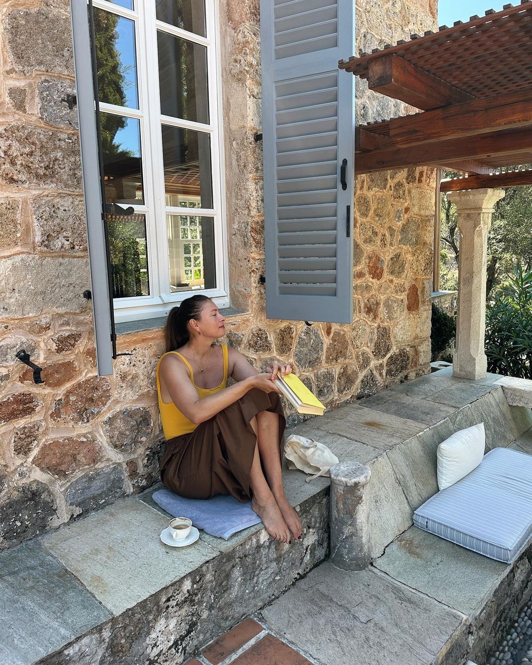 Η ίδια ανέβασε φωτογραφίες στον προσωπικό της λογαριασμό στο Instagram και στα στιγμιότυπα εμφανίζεται η ίδια να κάθεται στο πεζούλι ενός πέτρινου σπιτιού, κρατώντας το βιβλίο της. Σε μια άλλη φωτογραφία απολαμβάνει τη βουτιά της στα νερά της Μάνης (στην ‘προσωπική’ παραλία τους), ενώ στο τέλος φωτογραφίζει τον σύντροφό της, Alexander Gilkes (Αλεξάντερ Τζιλκς) και το παιδί τους.