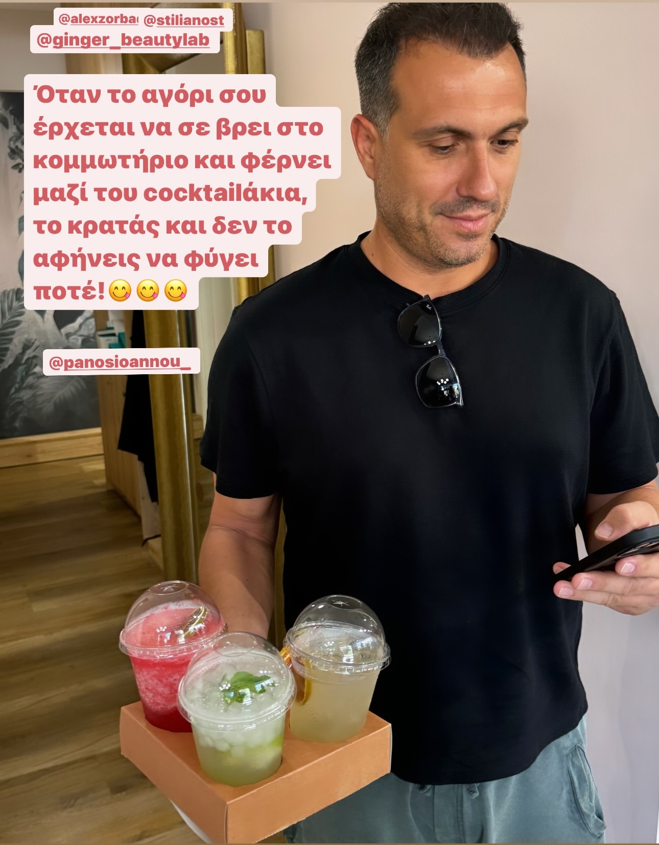 Όπως έκανε γνωστό η ίδια μέσα από story στο Instagram, o Πάνος Ιωάννου εμφανίστηκε στο κομμωτήριο για να τη δει φέροντας μάλιστα και δροσιστικά κοκτέιλ.