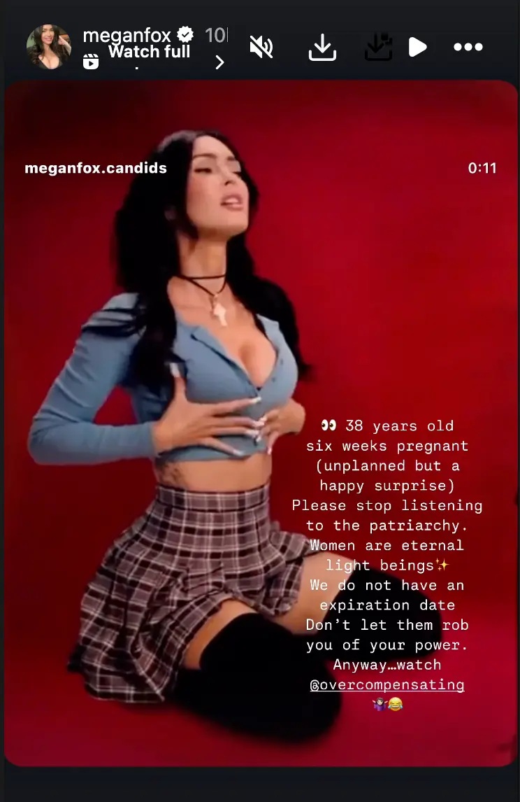 «38 χρόνων. Έξι εβδομάδων έγκυος (απρογραμμάτιστα, αλλά μια ευχάριστη έκπληξη)», έγραψε η Megan στα Insta Stories στις 21 Μαΐου, συνοδεύοντας ένα βίντεο από θαυμαστή όπου κάνει προώθηση της σειράς του Prime Video φορώντας ένα κοντό μπλουζάκι και μία πλισέ φούστα. «Σταματήστε να ακούτε το πατριαρχικό σύστημα. Οι γυναίκες είναι αιώνια όντα φωτός.»