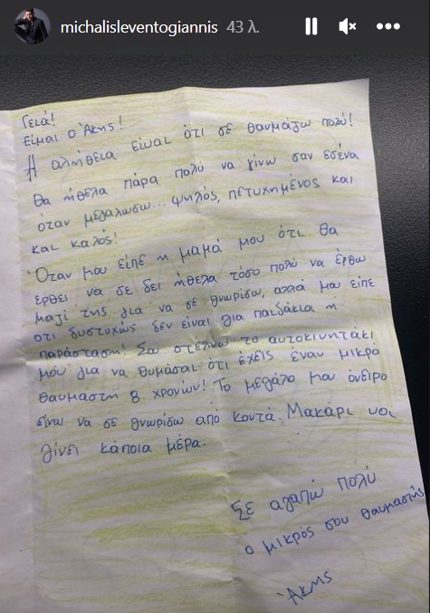 Ο Μιχάλης Λεβεντογιάννης είναι ενεργός στα social media. Συχνά μοιράζεται με τους διαδικτυακούς του φίλους στιγμές από την επαγγελματική και προσωπική του ζωή. Αυτή τη φορά ο ηθοποιός δημοσίευσε σε Insta Story το τρυφερό γράμμα που του έστειλε ένας 8χρονος θαυμαστής του. Ο μικρός Άκης του έστειλε και ένα δώρο, συγκεκριμένα ένα αυτοκινητικά.