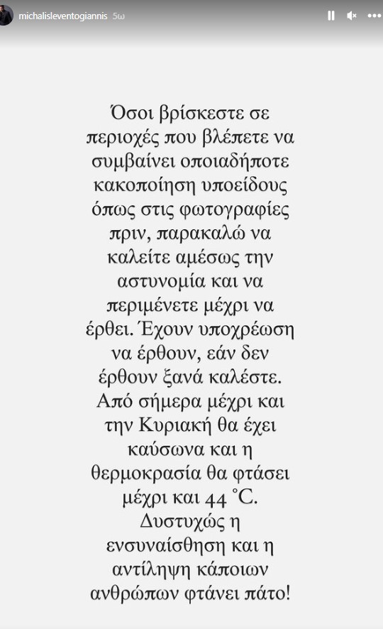 Από σήμερα μέχρι και την Κυριακή θα έχει καύσωνα και η θερμοκρασία θα φτάσει μέχρι και τους 44 βαθμούς. Δυστυχώς η ενσυναίσθηση και η αντίληψη κάποιων φτάνει πάτο”, έγραψε ο Μιχάλης Λεβεντογιάννης,