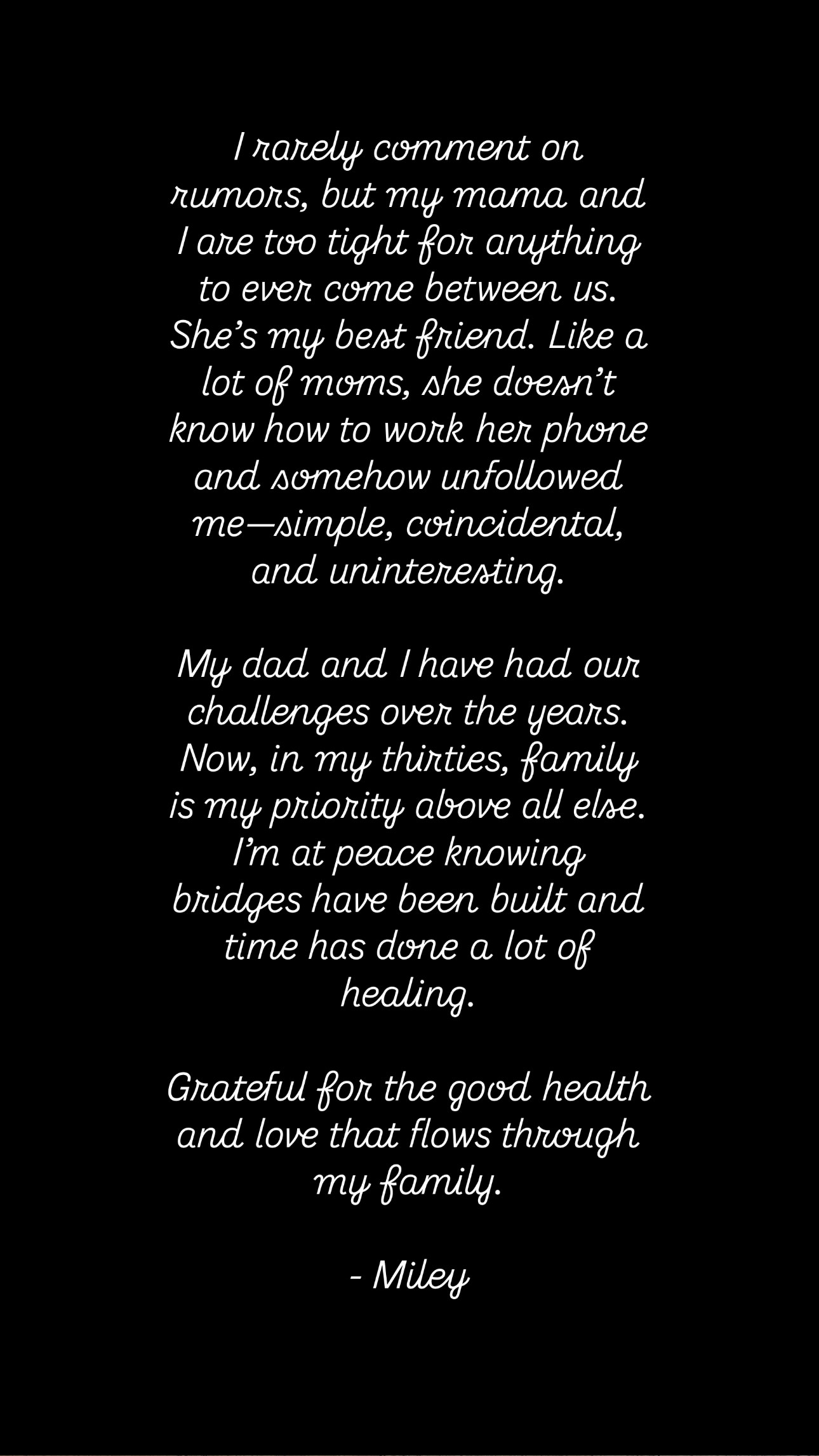 «Σπάνια σχολιάζω φήμες, αλλά η μαμά μου και εγώ είμαστε πολύ δεμένες και δεν μπορεί να μπει ποτέ κάτι ανάμεσά μας», έγραψε η τραγουδίστρια του “Wrecking Ball” μέσω των Instagram Stories της το Σάββατο.