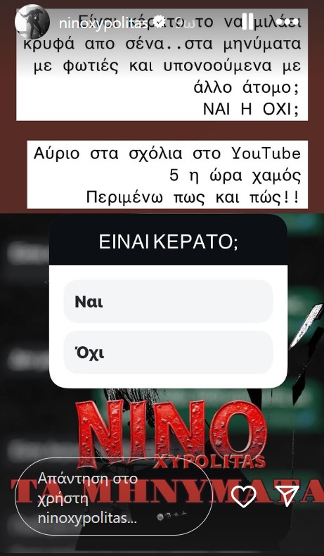 Συγκεκριμένα, ο Νίνο δημοσίευσε μία συνομιλία με μηνύματα που έχει ανταλλάξει με σύντροφό του, χωρίς να προσδιορίζει χρονικά πότε έχουν γραφτεί.
