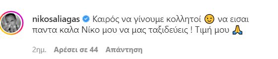 “Με τίμησε με την παρουσία του στο Ηρώδειο, τράβηξε μερικές εκπληκτικές φωτογραφίες και έκανε μια πολύ συγκινητική ανάρτηση για τη συναυλία! Φανταστείτε να ήταν και κολλητός μου! Κυρίες και κύριοι ο εξαιρετικός κύριος Νίκος Αλιάγας”, έγραψε ο τραγουδιστής με τον Νίκο Αλιάγα να σχολιάζει κάτω από την ανάρτησή του: “Καιρός να γίνουμε κολλητοί, Να είσαι πάντα καλά Νίκο μου να μας ταξιδεύεις ! Τιμή μου”.