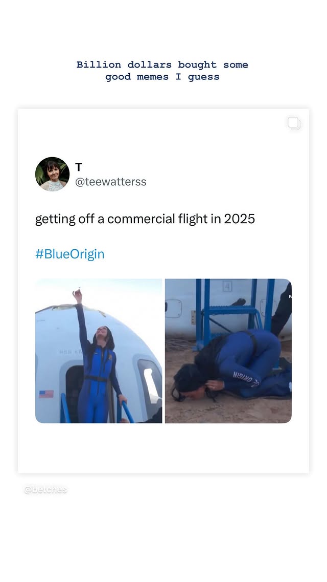 Η άλλη έδειχνε την τραγουδίστρια να φιλάει το έδαφος αφού κατέβηκε μερικά βήματα. Στην κορυφή των δύο φωτογραφιών υπήρχε ένα κείμενο που έγραφε: «Κατεβαίνοντας από μια εμπορική πτήση στο 2025 #BlueOrigin».