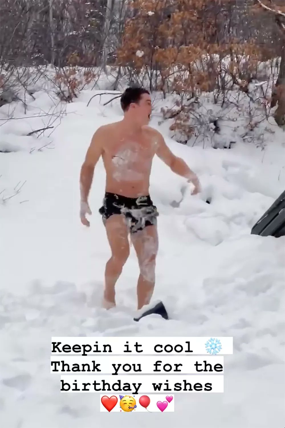 Ο σταρ είχε γενέθλια το Σάββατο και επέλεξε να τα γιορτάσει παίζοντας στο χιόνι, ενώ παράλληλα απολάμβανε το υπαίθριο τζακούζι με φίλους του. Γι’ αυτό αντί να ντυθεί καλά και ζεστά, αυτός βγήκε στο χιόνι με το μαγιό του και δεν δίστασε να κυλήσει στο λευκό τοπίο.