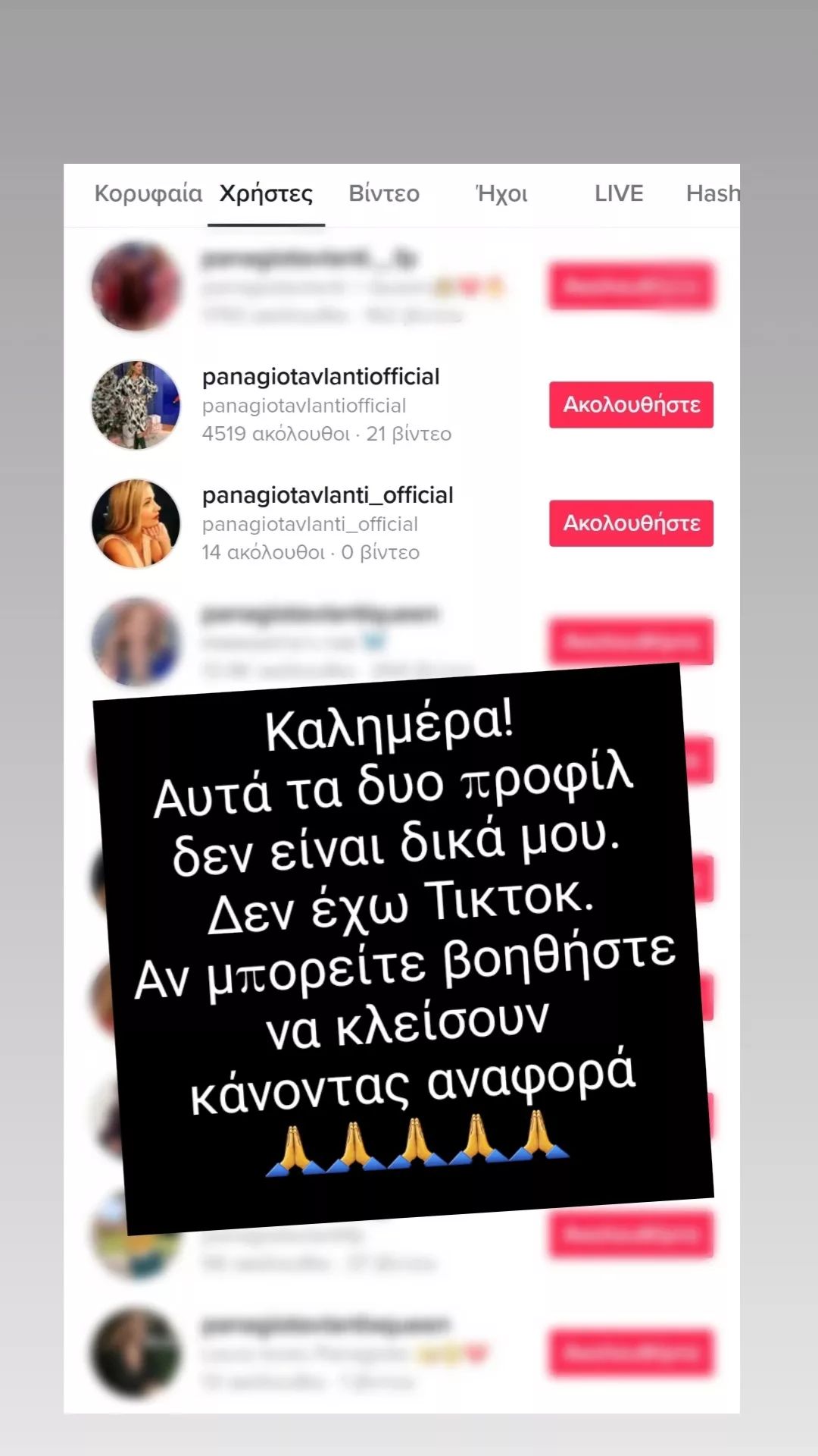 Έκκληση απηύθυνε η Παναγιώτα Βλαντή στους ακολούθους της στο instagram ώστε να τη βοηθήσουν και να κάνουν αναφορά σε δύο ψεύτικους λογαριασμούς στο TikTok με το όνομά της.