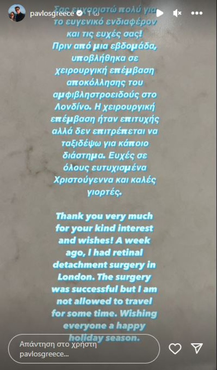 Σε story που έκανε ο Πρίγκηπας Παύλος, εξήγησε πως υποβλήθηκε σε επέμβαση απoκόλλησης του αμφιβιστροειδούς κι ευχαρίστησε όλους όσους του έστειλαν ευχές.