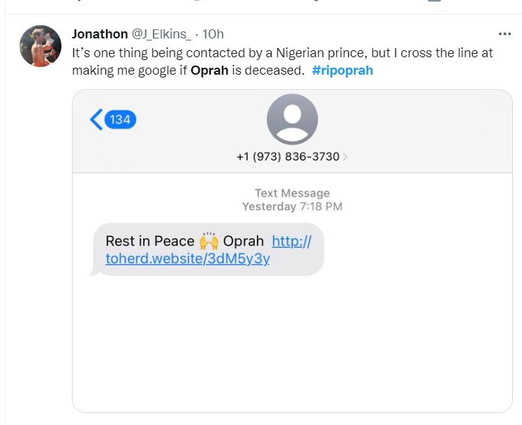 “RIP Oprah” αναφερόταν στο μήνυμα, κάτι που προκάλεσε φρενίτιδα στους χρήστες των μέσων κοινωνικής δικτύωσης οι οποίοι έσπευσαν να επιβεβαιώσουν αν η είδηση είναι αληθινή ή πρόκειται για έναν εντελώς άνοστο αστείο.