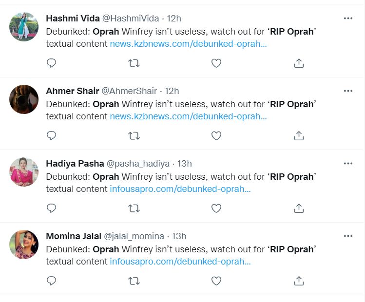 Debunked: Oprah Winfrey is not dead, beware of ‘RIP Oprah’ text https://t.co/nSd1OW1owB