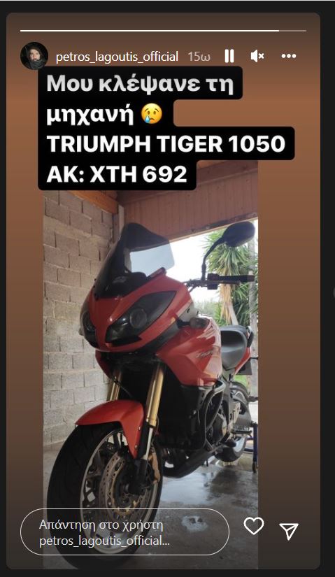 Την είδηση έκανε γνωστή ο ίδιος ο ηθοποιός με ανάρτησή του στο instagram όπου απηύθυνε έκκληση. Σε insta story ανέβασε φωτογραφία της μηχανής του αναγράφοντας τις πινακίδες της σε περίπωση που κάποιος από τους ακολούθους του την εντοπίσει.