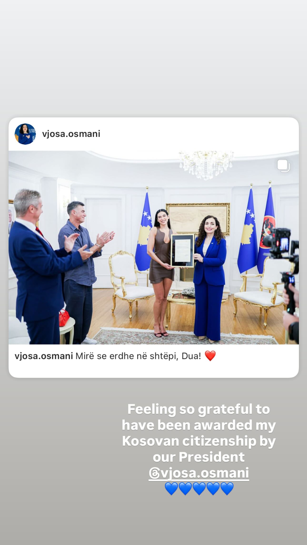 «Αισθάνομαι τόσο ευγνώμων που μου απονεμήθηκε η κοσοβάρικη υπηκοότητα από την πρόεδρό μας Vjosa Osmani», έγραψε χαρακτηριστικά σε ανάρτησή της στον προσωπικό της λογαριασμό στο Instagram.
