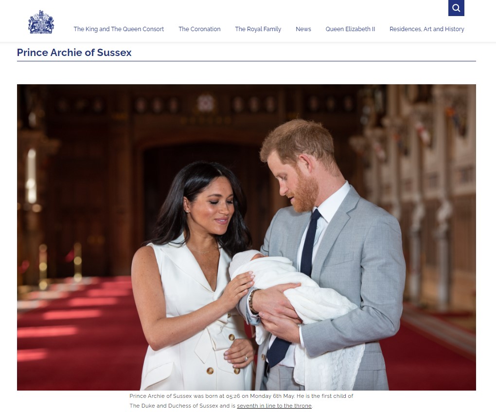 Η σελίδα με το βιογραφικό του μικρού πρίγκιπα στον ιστότοπο, η οποία ακόμη δεν έχει ενημερωθεί πλήρως μετά τον θάνατο της βασίλισσας, γράφει προς το παρόν: “Ο πρίγκιπας Archie του Σάσεξ γεννήθηκε στις 05:26 τη Δευτέρα 6 Μαΐου. Είναι το πρώτο παιδί του δούκα και της δούκισσας του Σάσεξ και είναι έβδομος στη σειρά διαδοχής του θρόνου.” Βέβαια, στο σημείο όπου αναφέρεται η πλήρης σειρά διαδοχής ο μικρός Archie καταγράφεται στη σωστή θέση.
