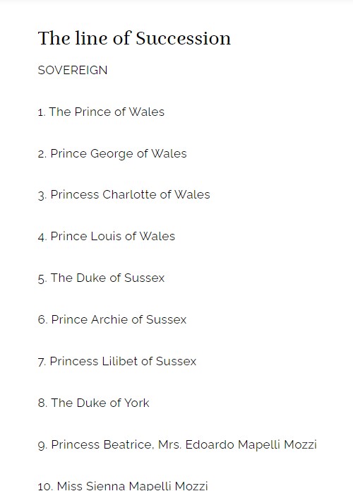 Ενώ, λοιπόν, ο τρίχρονος γιος του δούκα και της δούκισσας του Σάσεξ αποκαλείται πρίγκιπας Archie του Σάσεξ στον επίσημο ιστότοπο, στη σελίδα αναφέρεται ακόμη ότι είναι έβδομος στη σειρά διαδοχής του θρόνου, που ήταν η θέση του κατά τη γέννησή του τον Μάιο του 2019.