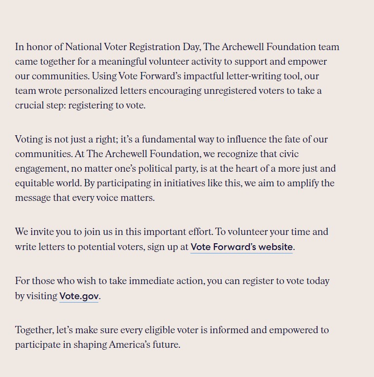 Σε μια ανάρτηση στον ιστότοπό του, το ίδρυμα εξήγησε ότι το προσωπικό του “συγκεντρώθηκε για μια ουσιαστική εθελοντική δραστηριότητα για την υποστήριξη και την ενδυνάμωση των κοινοτήτων μας”. Και πρόσθεσε: “Χρησιμοποιώντας το αποτελεσματικό εργαλείο επιστολογραφίας του Vote Forward, η ομάδα μας έγραψε εξατομικευμένες επιστολές που ενθάρρυναν τους μη εγγεγραμμένους ψηφοφόρους να κάνουν ένα κρίσιμο βήμα: να εγγραφούν στην ψηφοφορία”.