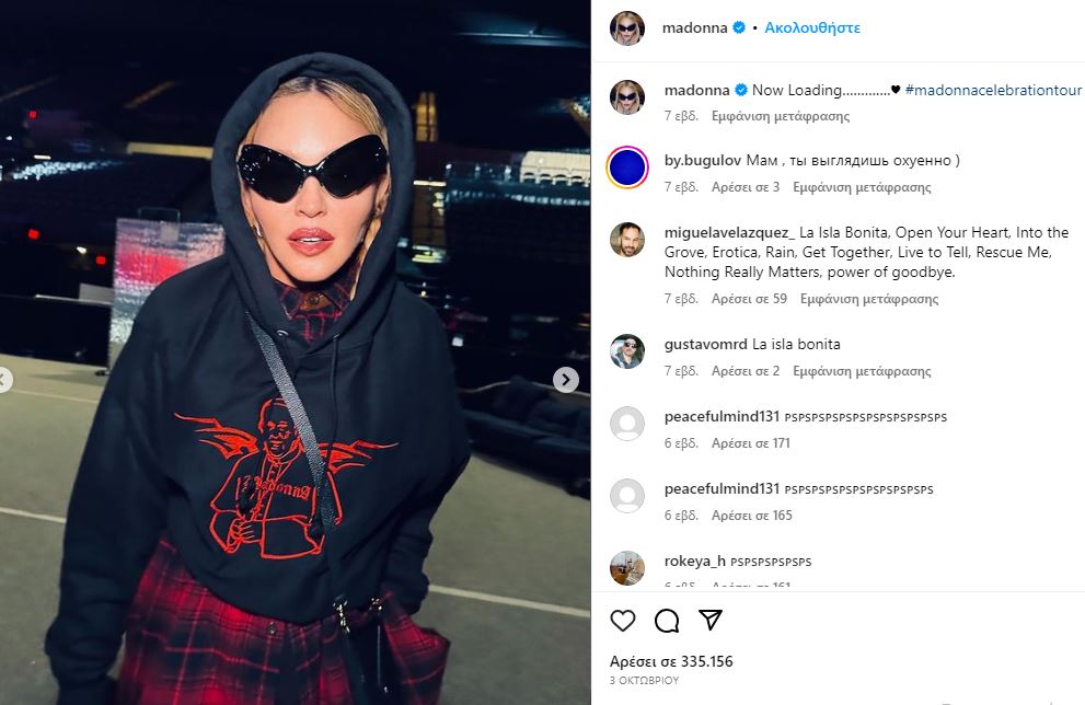 Αξίζει να σημειωθεί πως η πρώτη φορά που η Madonna φόρεσε το συγκεκριμένο μαύρο φούτερ ήταν τον περασμένο Οκτώβρη. Είχε μάλιστα ανεβάσει στο Instagram και σχετικές φωτογραφίες, προαναγγέλλοντας έτσι την περιοδεία της.