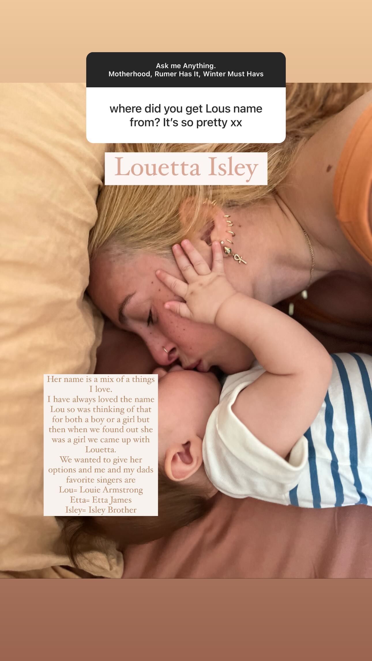 Απαντώντας σε ερωτήσεις θαυμαστών στο Instagram Story της, η Rumer εξήγησε ότι το όνομα του μωρού της, Louetta Isley, “είναι ένας συνδυασμός πραγμάτων που αγαπώ”.