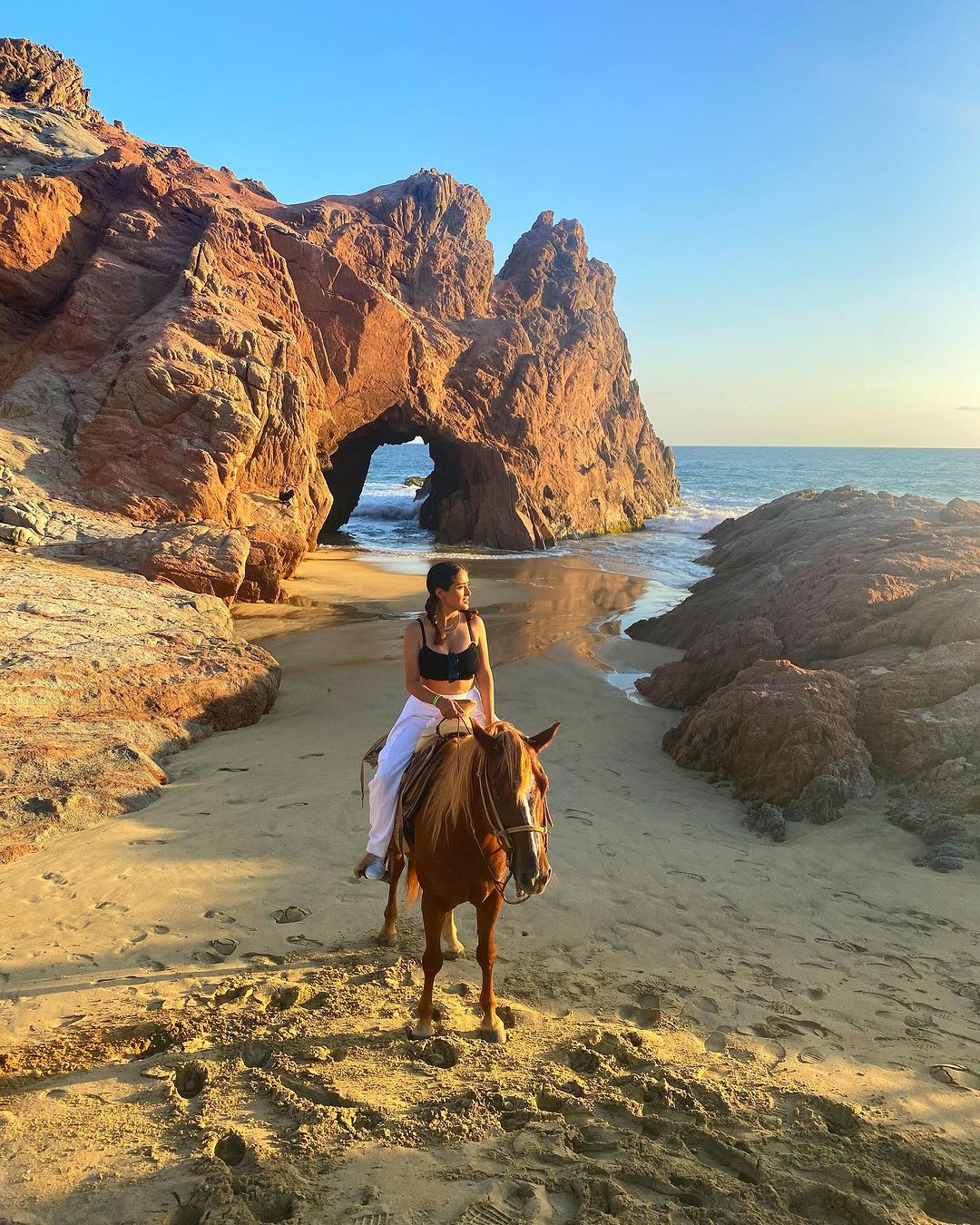 Η Salma Hayek έπλεξε τα μαλλιά της κοτσιδάκια, έβαλε λευκό μακρύ παντελόνι, ένα μαύρο crop top και ανέβηκε σε άλογο για μια ρομαντική βόλτα σε παραλία του Μεξικού, με φόντο το ηλιοβασίλεμα.