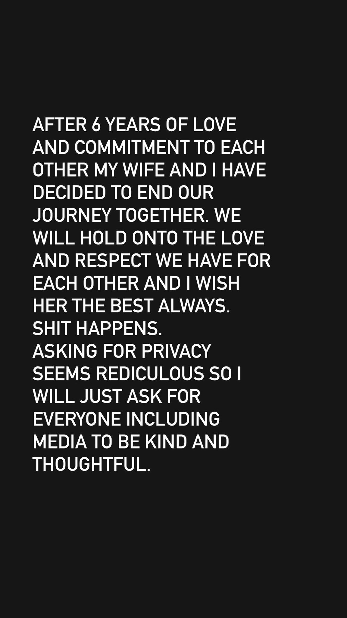 Στη λιτή ανακοίνωση που εξέδωσε σε story στο Instagram, ο 29χρονος λέει: «Έπειτα από 6 χρόνια αγάπης κι αφοσίωσης ο ένας στον άλλον, η γυναίκα μου κι εγώ αποφασίσαμε να τελειώσουμε το κοινό ταξίδι μας. Θα κρατήσουμε την αγάπη και τον σεβασμό που έχουμε ο ένας για τον άλλον και της εύχομαι τα καλύτερα πάντα. Μαλ@@ γίνονται.Το να ζητάς ιδιωτικότητα φαίνεται γελοίο, επομένως θα ζητήσω από όλους, συμπεριλαμβανομένων των Μέσων ενημέρωσης, να είναι ευγενικοί και στοχαστικοί», έγραψε τη στιγμή που χθες η 41χρονη με ανάρτησή της στο Instagram αυτό για το οποίο ανησυχεί είναι σχετικά με την αγορά … αλόγου.