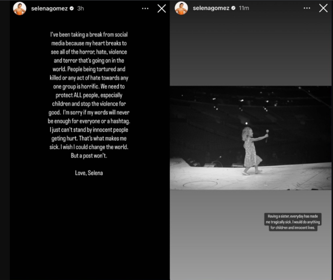 Αξίζει να σημειώσουμε πως πριν τέσσερις ημέρες η Selena Gomez είχε πάρει θέση για τη σύγκρουση στη Γάζα. «Έχω κάνει ένα διάλειμμα από τα μέσα κοινωνικής δικτύωσης. H καρδιά μου ραγίζει βλέποντας το μίσος, τη βία και τον τρόμο που συμβαίνει στον κόσμο. Υπάρχει φρίκη» έγραψε τη Δευτέρα 30 Οκτωβρίου. «Είναι οδυνηρό ομάδες ανθρώπων να βασανίζουν και να σκοτώνουν ανθρώπους. Είναι φρικτό. Πρέπει να προστατεύουμε όλους τους ανθρώπους, ειδικά τα παιδιά. Να σταματήσουμε τη βία οριστικά. Λυπάμαι αν τα λόγια μου δεν θα είναι ποτέ αρκετά για όλους. Μακάρι να μπορούσα να αλλάξω τον κόσμο. Αλλά μια ανάρτηση δεν θα το κάνει. Με αγάπη, Selena».
