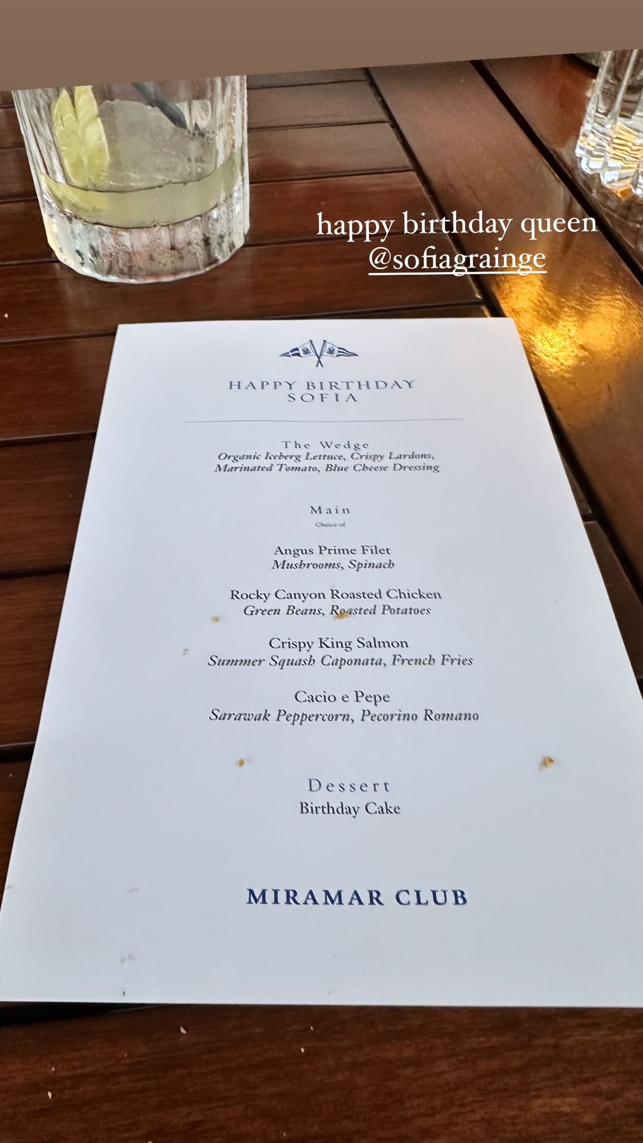 Η Richie Grainge αργότερα μοιράστηκε εκ νέου στα Instagram Stories της μια φωτογραφία από το μενού που σερβιρίστηκε για το γεύμα των γενεθλίων της, το οποίο πραγματοποιήθηκε στο Miramar Private Beach Club and Resort στο Montecito της Καλιφόρνια.