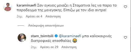«Σαν έγκυος μοιάζει η Σταματίνα λες να πάρει το παράδειγμα της Μενεγάκη; Ελπίζω με τον ίδιο άντρα!» αναφέρει ένα από τα σχόλια.