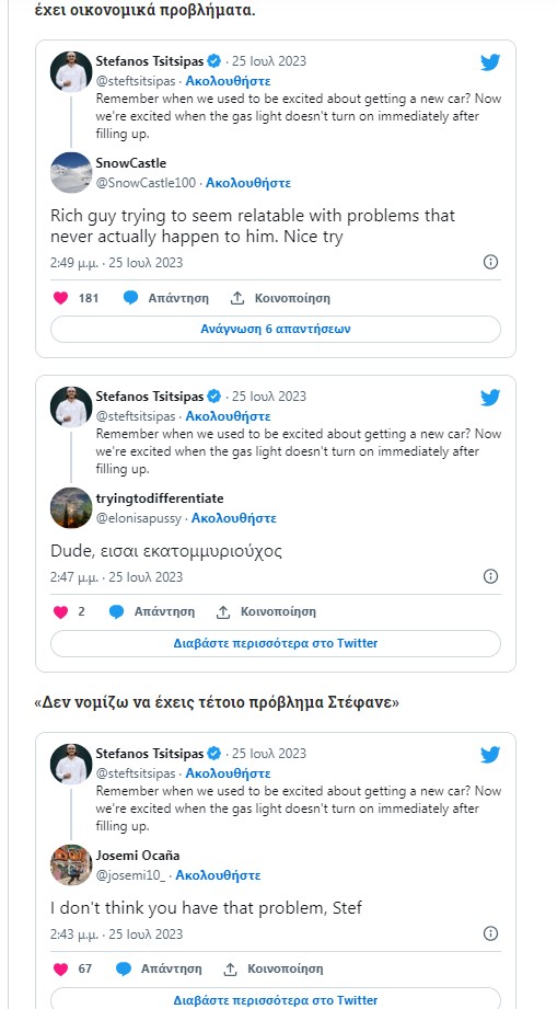 Όπως ήταν φυσικό η ανάρτηση του Έλληνα τενίστα προκάλεσε τις έντονες αντιδράσεις των χρηστών του Twitter, που επισήμαιναν ότι εκείνος είναι εκατομμυριούχος και δεν τον απασχολεί η τιμή της βενζίνης.