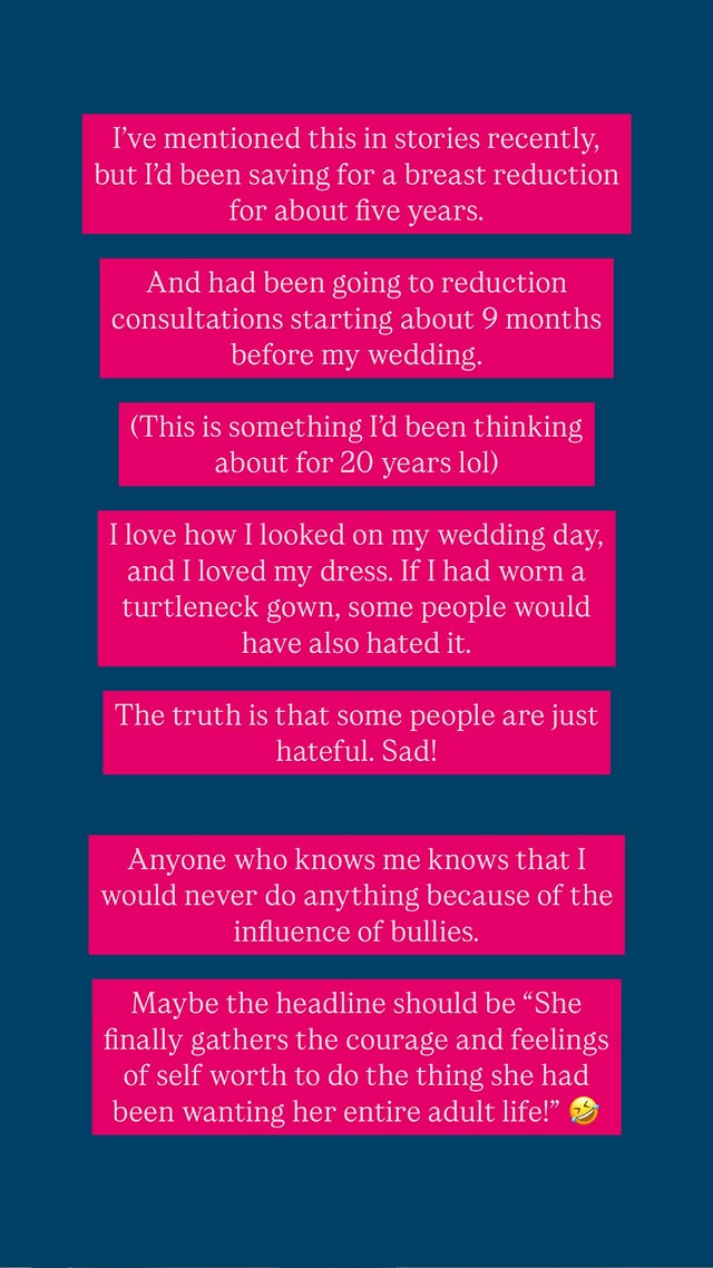 Πάντως, σε νεότερα Insta Stories διευκρίνισε ότι δεν συνδέονται οι επικρίσεις με τηναπόφασή της να κάνει επέμβαση μείωσης στήθους, Αντιθέτως, αποκάλυψε ότι συγκέντρωνε χρήματα εδώ και πέντε χρόνια για να κάνει αυτήν την επέμβαση.