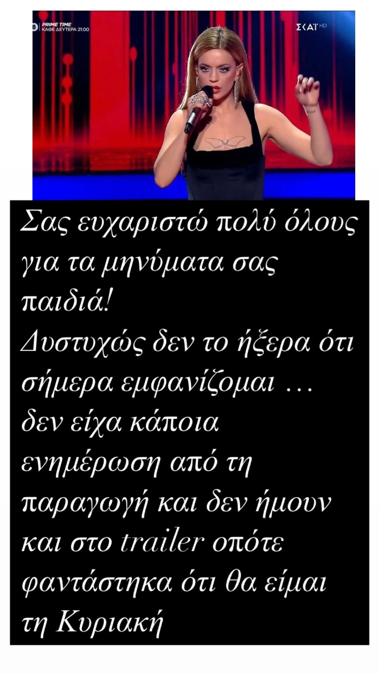 Συγκεκριμένα η ηθοποιός έγραψε στη δημοσίευσή της: «Σας ευχαριστώ πολύ όλους για τα μηνύματά σας παιδιά! Δυστυχώς δεν το ήξερα ότι σήμερα εμφανίζομαι… δεν είχα κάποια ενημέρωση από την παραγωγή και δεν ήμουν και στο trailer οπότε φαντάστηκα ότι θα είμαι την Κυριακή».