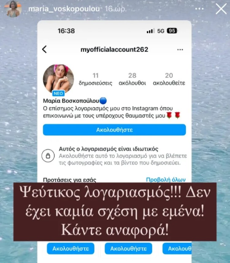 Η κόρη του Τόλη Βοσκόπουλου και της Άντζελας Γκερέκου ενημέρωσε σχετικά τους διαδικτυακούς της φίλους ζητώντας τους παράλληλα να κάνουν αναφορά προκειμένου να διαγραφεί ο fake λογαριασμός.