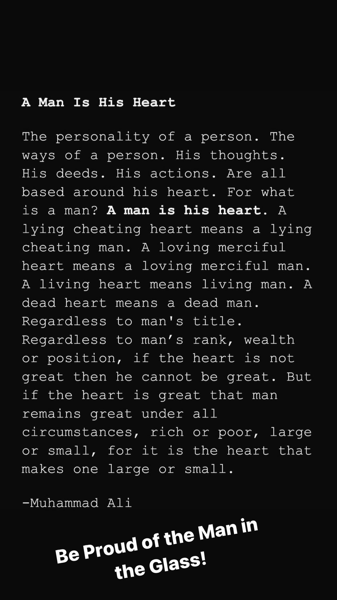 “Η προσωπικότητα ενός ανθρώπου. Οι τρόποι του. Οι σκέψεις του. Οι ενέργειές του. Οι πράξεις του. Όλα έχουν βάση την καρδιά του” ανέφερε η φράση του αείμνηστου θρύλου του μποξ. “Γιατί τι είναι ο άνθρωπος; Ο άνθρωπος είναι η καρδιά του. Μια ψεύτικη, άπιστη καρδιά είναι ένας ψεύτης, άπιστος άνθρωπος. Μια καρδιά ελεήμων που ξέρει να αγαπά σημαίνει άνθρωπος ελεήμων που ξέρει να αγαπά”