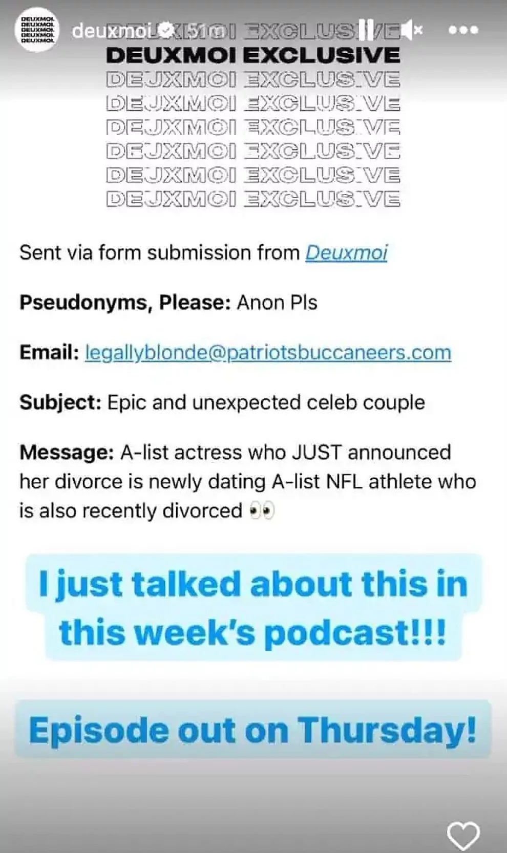 “A-list ηθοποιός που μόλις ανακοίνωσε το διαζύγιό της βγαίνει πρόσφατα με A-list αθλητή του NFL που είναι επίσης πρόσφατα χωρισμένος”, υποστήριξε o πληροφοριοδότης, ενώ έκανε ακόμη πιο ξεκάθαρο σε ποιους αναφερόταν χρησιμοποιώντας τη διεύθυνση ηλεκτρονικού ταχυδρομείου legallyblonde και @patriotsbuccaneers.com, αναφερόμενος στη διάσημη ταινία της Witherspoon και στις δύο ομάδες NFL του Brady.