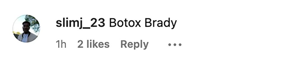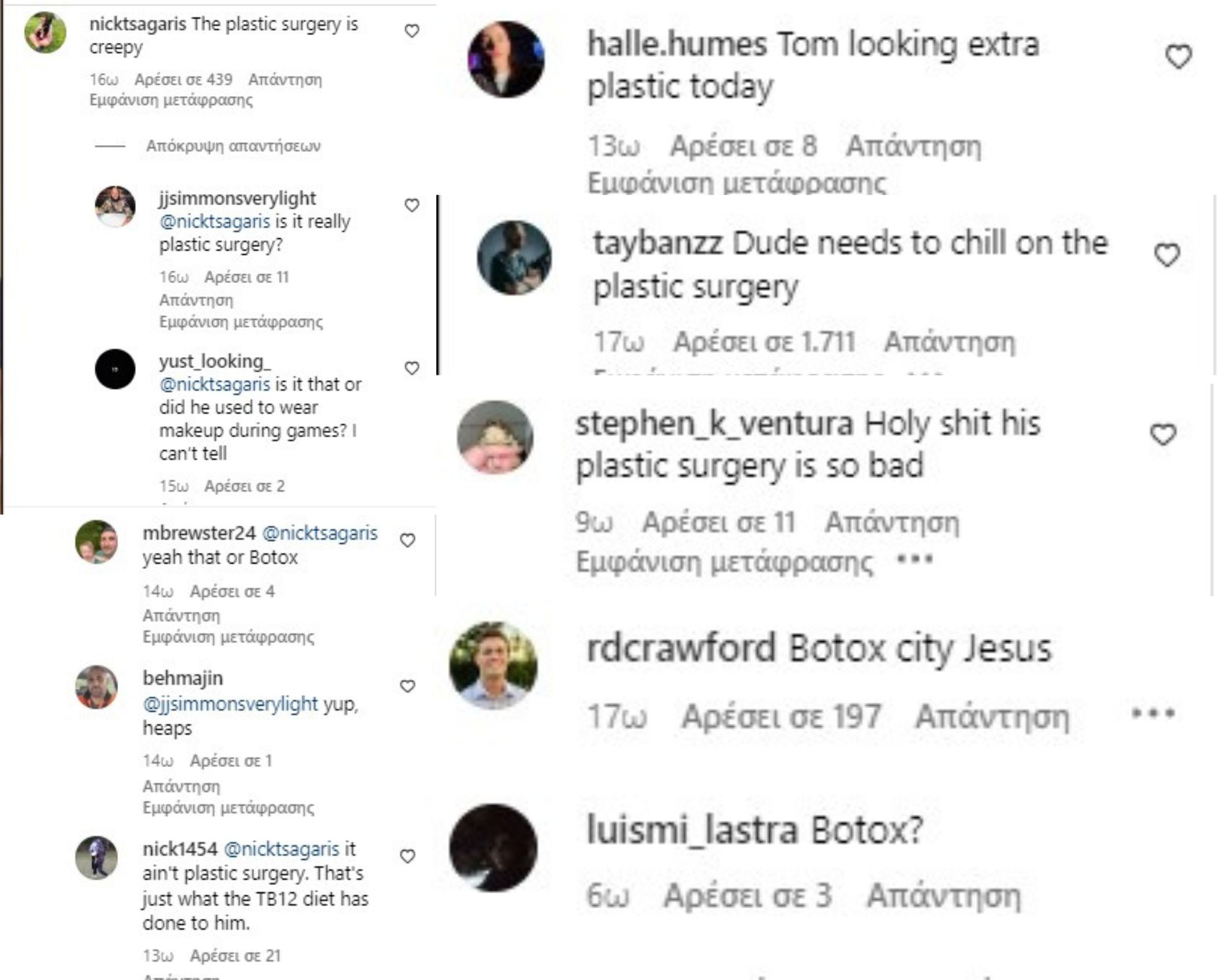 Πέρα από κάποιους ακολούθους στο Instagram που σχολίασαν ποδοσφαιρικά τον Brady, αρκετοί ήταν αυτοί που ασχολήθηκαν με την εμφάνισή του. “Φίλε, πρέπει να χαλαρώσει με τις πλαστικές επεμβάσεις”, έγραψε ένας χρήστης με δεύτερο να προσθέτει: “Η πλαστική χειρουργική είναι ανατριχιαστική”