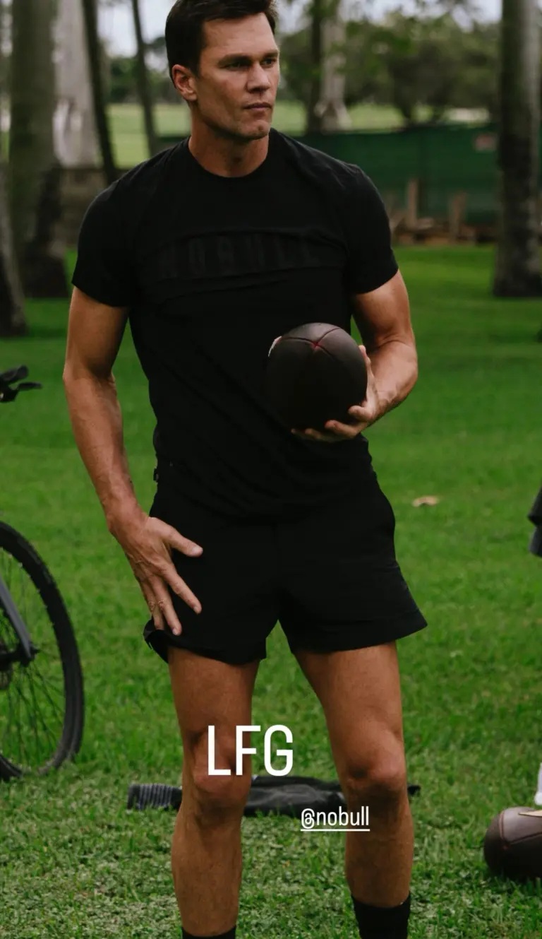 «Yuppppppp 100», έγραψε πάνω στη φωτογραφία. Σε επόμενο story, ο Brady δημοσίευσε ένα πιο τολμηρό στιγμιότυπο με ποδοσφαιρική διάθεση: Εμφανίζεται να φορά μαύρο εφαρμοστό T-shirt και ασορτί σορτς, τονίζοντας το μπούστο του, ενώ κρατά μια μπάλα αμερικανικού ποδοσφαίρου με το αριστερό του χέρι. Στην ανάρτηση, ο Brady έκανε tag το brand αθλητικών ειδών του, No Bull.